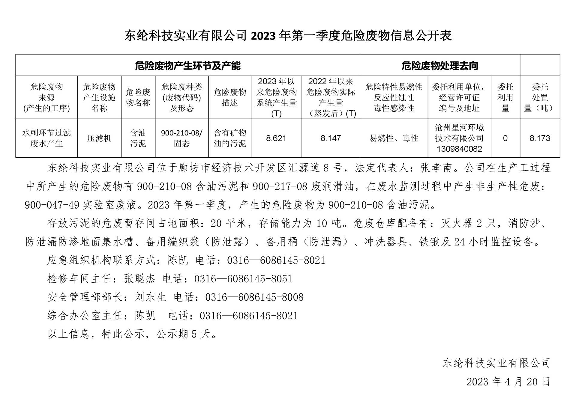 東綸科技實(shí)業(yè)有限公司2023年第一季度危險(xiǎn)廢物信息公開表