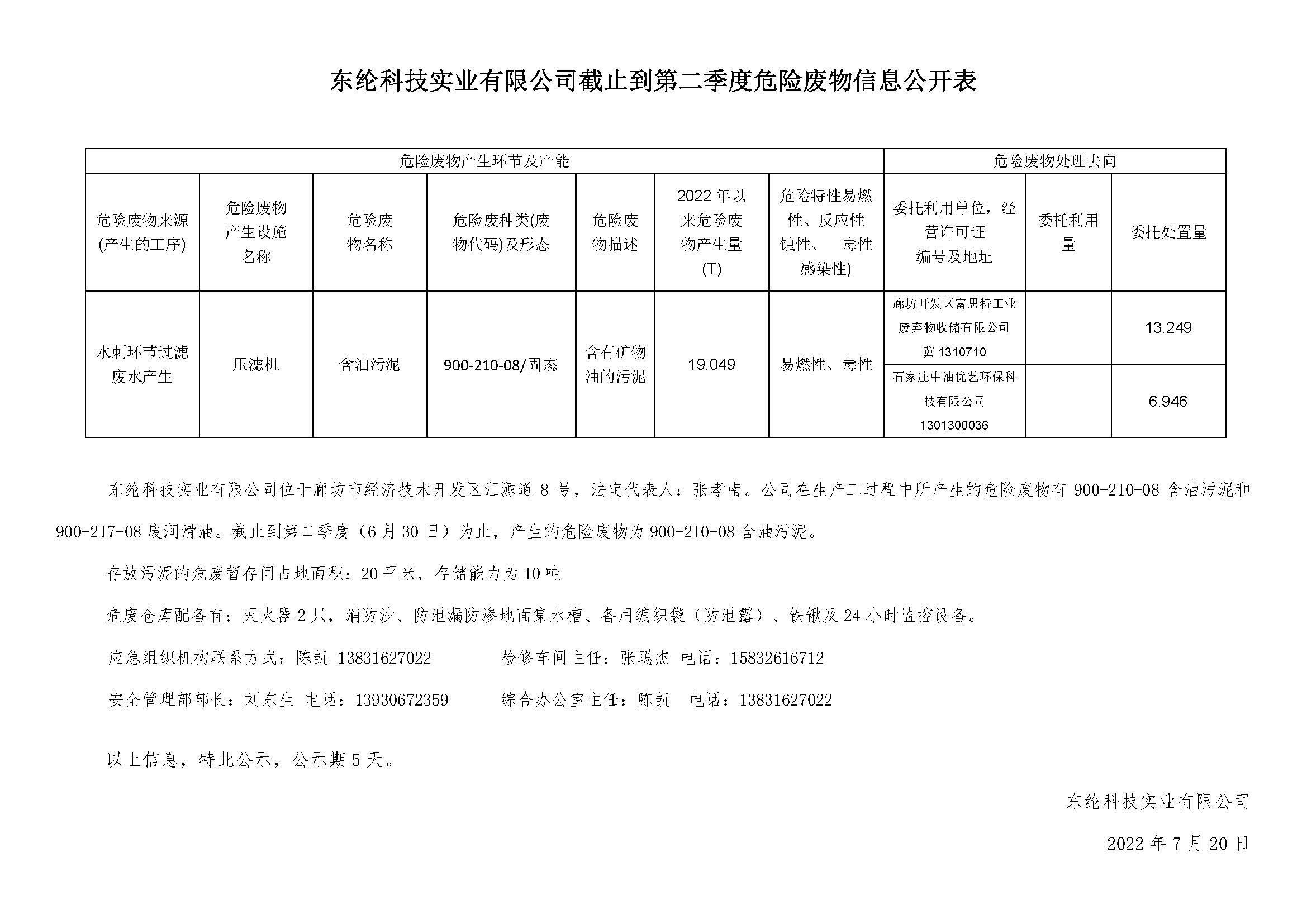 東綸科技實(shí)業(yè)有限公司第二季度危險廢物信息
