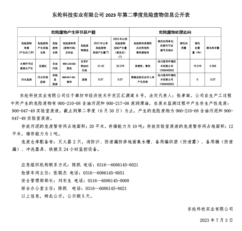 東綸科技實(shí)業(yè)有限公司2023年第二季度危險(xiǎn)廢物信息公開表